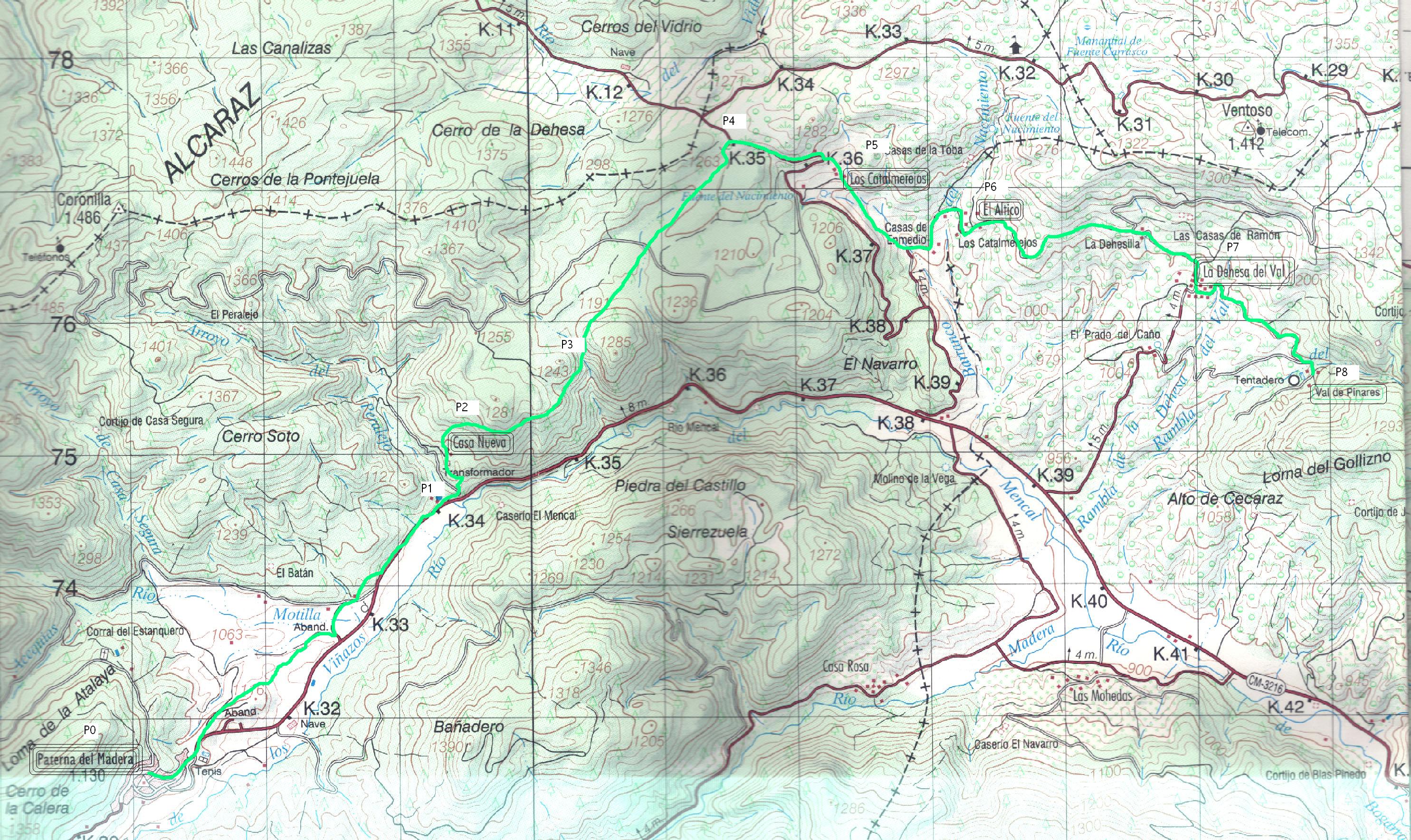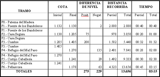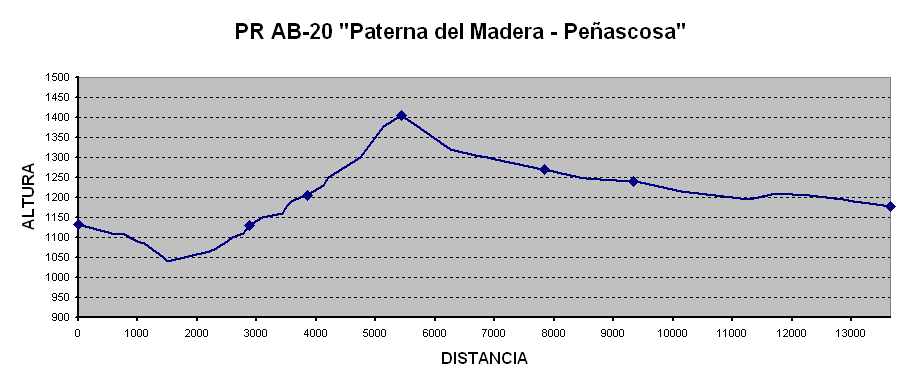 Se inicia el camino tomando la carretera en dirección a Bogarra. Justo al abandonar las últimas casas del casco urbano, dejando a la derecha la piscina y la pista polideportiva; a la izquierda de la carretera sale un camino que conduce a las eras de San Miguel. Se continúa por él, teniendo la precaución de no subir a las eras, sino de tomar el que va bajando por la ladera, hasta llegar al vallecillo situado al pié de las eras en su cara norte. El camino por él es de una tierra arcillosa de color rojizo intenso. Cruzamos el Río Matilla -formado de la cercana unión del de La Fuente del Roble y del de Las Acequias- y comenzamos a ascender hasta un carril en buen estado. Giramos a la izquierda y apenas lo andamos unos escasos diez metros, pues ya vemos en el margen derecho el camino que va ascendiendo en la ladera del cerro Pino Blanco, dejando a su derecha El Batán. No tardamos mucho en encontrar la Fuente de los Bandoleros, a la que accedemos cruzando el arroyo de Casa Segura, al que van a parar también las aguas de la fuente, en la que podemos descansar y refrescarnos, a pesar de que apenas llevamos andados unos tres kilómetros. El paraje merece la pena, es un lugar escondido -de ahí el nombre- y resguardado de los rigores del sol veraniego. Seguimos nuestro camino, ascendiendo, para encontrar en apenas un kilómetro Casa Segura. Hermoso lugar, en el que vemos las ruinas de un cortijo grande, construido de espaldas al monte y dando cara a un prado hermoso que, en el momento que lo andamos, está plagado de flores silvestres. El viajero levanta los ojos, se recrea contemplando las vistas de la casa, del prado, de la cumbre arriba y de las eras que vieron en inicio de nuestro camino, junto a Paterna. Pero el camino invita a seguir, a pesar de que es ahora cuando nos exigirá un esfuerzo suplementario, para ascender unos 200 metros, en apenas kilómetro y medio, para llegar a la Cumbre, por el Collado de la Cañada. Estamos en la cuerda del Almenara, que separa las aguas hacia la vertiente mediterránea -hasta ahora- y hacia la vertiente atlántica -a partir de ahora-. Desde aquí la vista alcanza lejos, los pulmones se llenan, las venas se ensanchan y los sentidos se recrean en el placer a todo vigor. En la Cumbre encontraremos un carril en buen estado, que habremos de tomar a nuestra derecha, para en unos metros optar por la izquierda en la bifurcación. No es difícil encontrar caballos libremente abrevando en las fuentes de estos parajes, los cuidan y los aman unos vecinos del cercano Cortijo de Los Tajones. Comenzamos a bajar suavemente por el camino que se desliza acunado entre las alturas de su izquierda: Cerro de Las Palomas, Loma Alta y Cerro de las Calenturas; y las de su izquierda: Majada de las Vacas, Cerrajón y Cerro Bartolo; hasta llegar al Refugio del Mal Paso -romántico nombre-; al que llegaremos unos dos kilómetros y medio después, y tras haber tomado el camino asfaltado con el que topamos hacia la derecha. Esta es una zona habilitada para la acampada, con todos los servicios necesarios para ello. Habremos de indicar que a primeros del mes de Agosto -cuando andamos este camino- todavía no hemos encontrado a ningún caminante ni campista. Si para el encuentro con la naturaleza, se busca la soledad, éste es el lugar preciso. A unos escasos 800 metros del Refugio, encontramos en la misma orilla de la carretera, un curioso ejemplar de hermanamiento botánico: el Pino-Roble. A poco más de kilómetro y medio, se une a nuestro camino -por la derecha- la Vereda de la Huesa, que sigue junto a nosotros sin dejar el asfalto hasta llegar, sin posible pérdida, a Peñascosa, por terreno llano que poco a poco se va abriendo más.