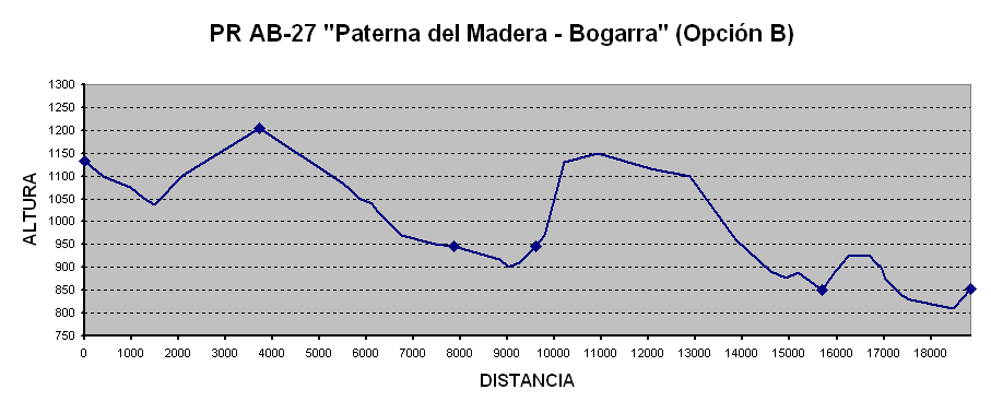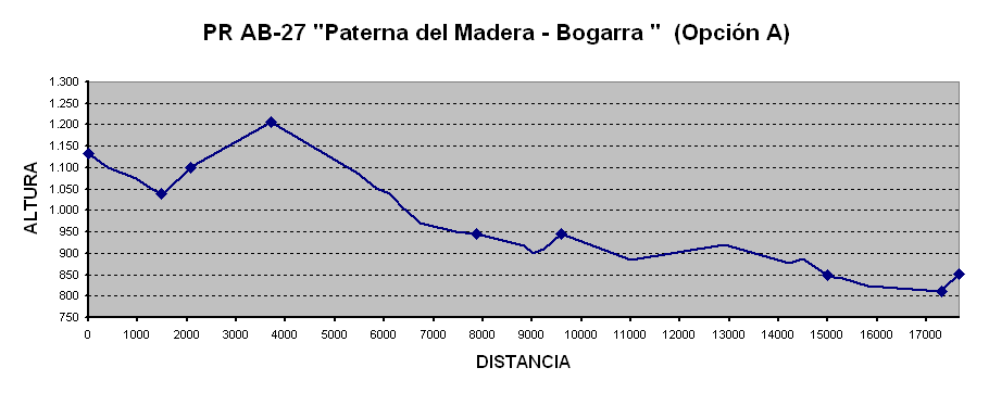 Opción B Desde Las Mohedas, nos vamos a dirigir por la Loseta de las Mohedas, dejando el valle del río -y la carretera- abajo, a nuestra izquierda, andando por pistas forestales y algún camino menos marcado, para unirse de nuevo, a la opción A, en el carril de las Yegüerizas, cerca del puente sobre el río Bogarra, que hemos de seguir a nuestra izquierda, para continuar hasta las Casas del Batán. Desde el Batán, para seguir el camino de herradura, hemos de cruzar el arroyo del Ventorrillo y subir rápidamente hasta llegar a una pequeña construcción junto a una era -ambas ya abandonadas-. A partir de aquí el camino se va haciendo más claro, ya que se unía al camino que venía de Las Fábricas de San Juan (Riópar), y sigue paralelo el curso del río desde lo alto. A nuestra derecha, algo más de un kilómetro antes de llegar a Bogarra, sale de la roca una fuente, lo que no viene mal teniendo en cuenta el camino hecho. A Bogarra entramos, después del cruzar nuevamente el río, por la calle Puente Chica y su continuación, Horma Caída. Esta opción tiene desde Paterna, 18.846 m., es más dificultoso y se precisa más de cinco horas para recorrerlo. |