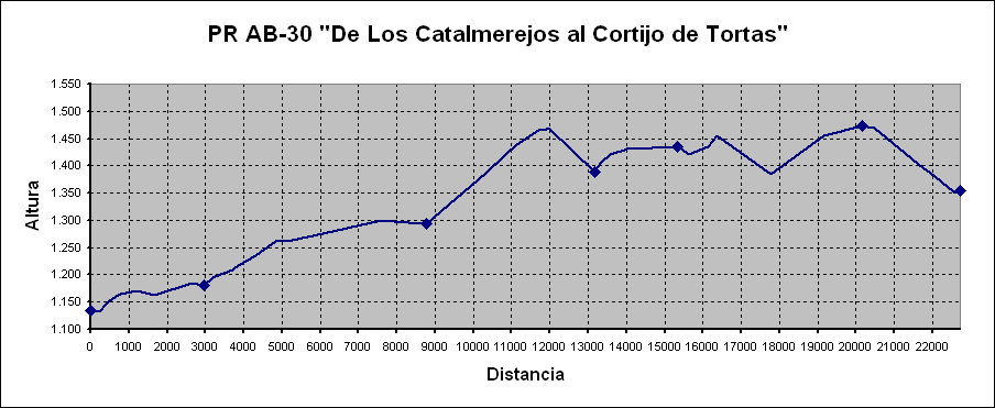 Desde Los Catalmerejos, se toma la pista en dirección oeste. En cuatrocientos metros se cruza la carretera que viene de Peñascosa a la de Bogarra-Paterna, y se continúa por la pista forestal que ya no vamos a abandonar en todo el recorrido. Al llegar al km. 3 de nuestro recorrido cruzamos el sendero PR AB-28 y continuamos con una suave pero permanente ascensión, por los Llanos de Los Catalmerejos, entre campos de cultivo y monte. Cuando llevamos casi nueve kilómetros desde el inicio, ya hemos ganado altura -estamos a 1.300 m.- y las vistas han comenzado a ser amplias. Nos encontramos, a la izquierda, con el inicio del SL AB-12, atractivo sendero local que nos podría conducir hacia Casa Nueva, pasando por las ruinas del Peralejo.