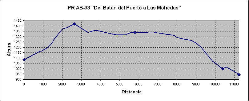 Cuando llevamos 2.630 metros, hemos llegado -subiendo por la ladera de la montaña- a un collado, situándonos en lo más alto del camino. Es el momento de hacer un alto por una doble razón: habrá que tomar aire, ya que hemos salvado 333 metros de desnivel en una ascensión importante; y habrá también que admirar los paisajes que se abren a nuestros ojos. Tras esto, vamos a continuar en dirección este, por una senda o trocha; hasta llegar en unos setecientos metros a un cruce de carriles: atravesamos aquí el PR AB-26 “De Paterna del Madera a La Vegallera (pasando por Río Madera)”. Seguimos por un carril en dirección este. Nos encontramos en una altiplanicie conocida por Las Mesas. A nuestra izquierda queda el alto de Peñalta.