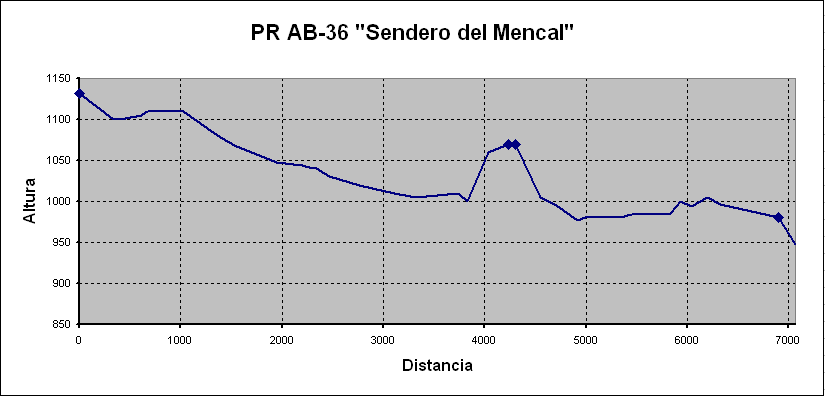En 1.200 metros llegamos a un tramo de la antigua carretera que conducía a Paterna. La seguimos a la derecha, abandonando así el recorrido del camino histórico de Albacete (el PR AB-28, que conduce a Los Catalmerejos). En unos metros llegamos a la carretera CM-3216, que seguimos a la derecha, para abandonarla enseguida por un camino ancho que sale a nuestra izquierda y que va a invertir la dirección que traíamos, siguiendo ahora hacia el este - noreste, que ya no vamos a abandonar. En cuatrocientos metros cruzamos el río Viñazos, a unos escasos diez metros de su unión con el río de la Fuente del Roble. La unión de ambos recibe el nombre de río del Mencal hasta su unión con el Madera.